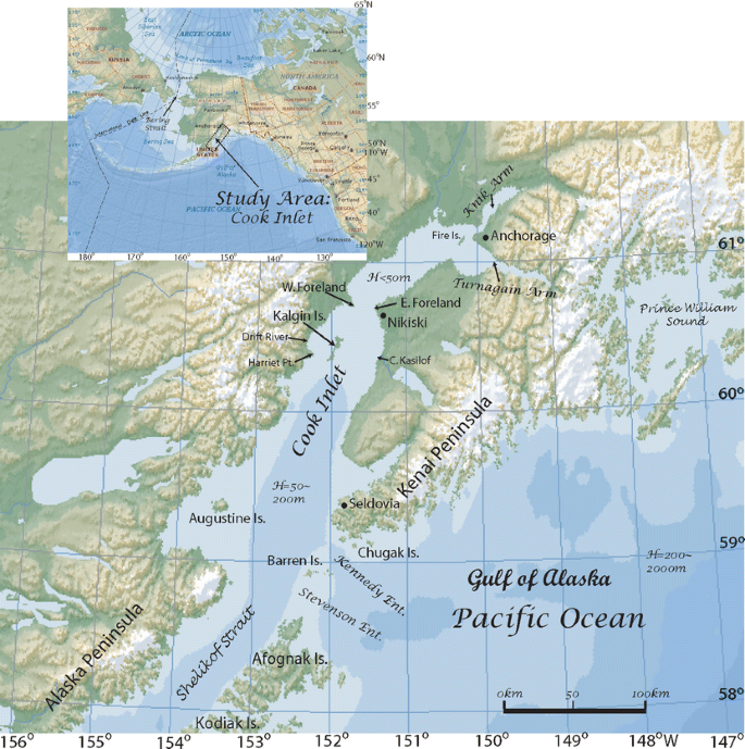 Bathymetry Of Cook Inlet Alaska With An Interpolated Depth Surface Download Scientific Diagram from www.researchgate.net Both 'arms' and the near vicinity of anchorage are known generically as upper cook inlet. Located west of kenai peninsula, extends southwest 220 miles from anchorage to its junction with shelikof strait at barren is., aleutian range. Cook inlet extends 180 miles from the gulf of alaska to anchorage where it is split into the turnagain arm and the knik arm. He was searching for the northwest. It was named for captain james cook, a british explorer, navigator, and cartographer in the british royal navy. Of the two, turnagain is more 'famous,' and 'visible,' as the seward. It is visible from one's approach to the city on the seward highway. Cook inlet actually spans from homer and kachemak bay, on the south, at the interface of the gulf of alaska, to about 15 miles north of anchorage as knik arm, and east of anchorage as turnagain arm (where the famous 'bore tides' run).